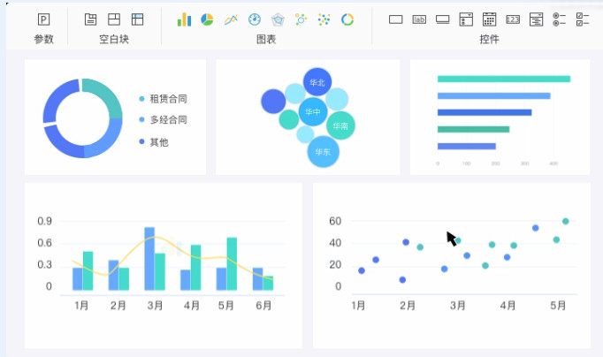 自主研发的 HTML5 图表,支持接入 Echarts 等第三方控件 |