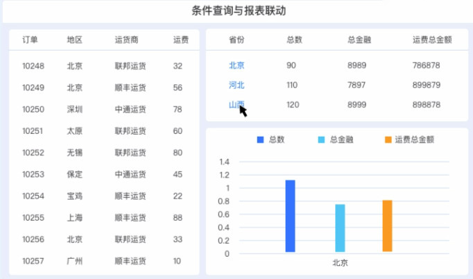 通过参数配置实现报表查询、数据过滤,以及联动、钻取分析 |