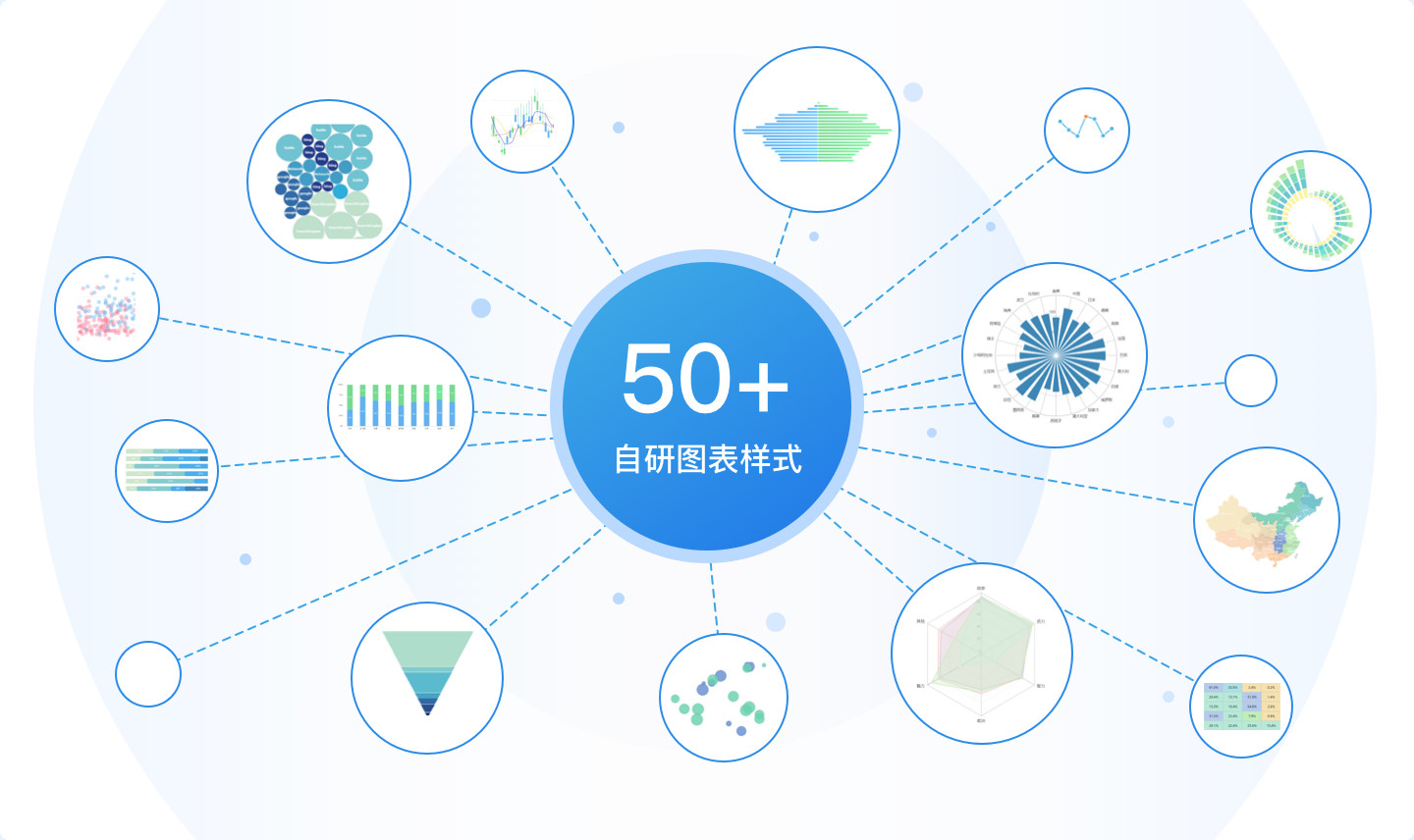 自研50+图表样式,包含3D、动效,满足绝大部分展示和 酷炫需求 |